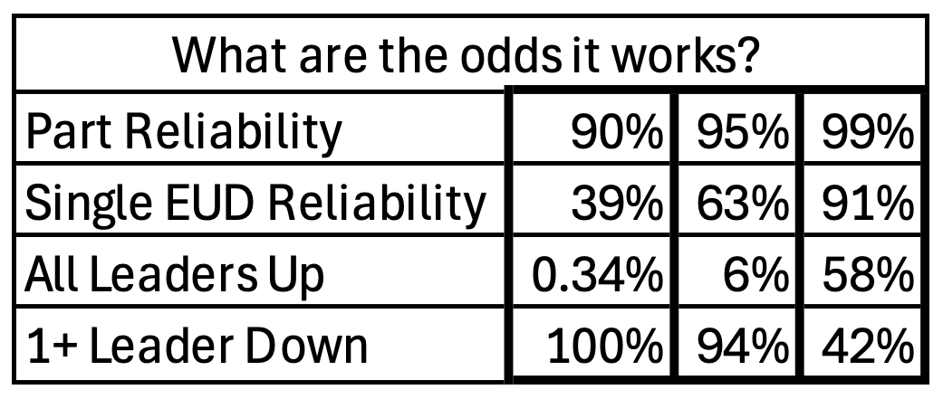 Do the math: if each part has a 90% chance of working, the whole stack only works 39% of the time. Across six key leaders in my company, the chance we all stay connected is 0.34% — about 1 in 300. Raise the reliability to 95% per part, and the odds of all six working is still just 6%.