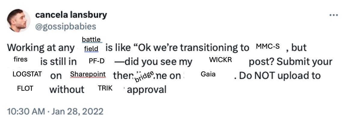 In reading this post before publication, I’m realizing that it gives a largely negative view of the world. These problems are critical and deserve urgent attention and solutions. But they’re also symptomatic of growing pains. The Nett Warrior system I pan was a product of an archaic acquisition process that is being reformed. The DoW is rolling out new software approval pathways this fall. Many of the drones that I note are not connected to our system hadn’t even been procured a few months ago. Wickr and Maven were only recently adopted. This post is meant to provide a snapshot of the pain points on the frontlines, so that progress heads in the right direction — and happens quickly.